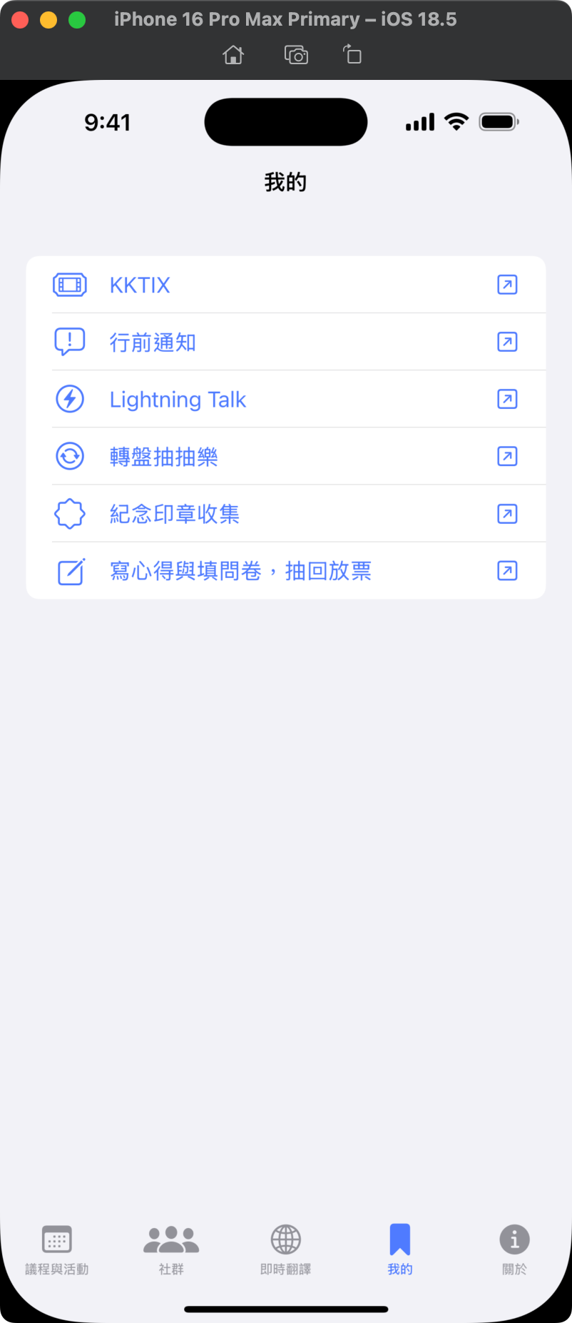 第一天晚上有 After Party 與 Lightning Talk。另外還有轉盤抽抽樂、紀念印章蒐集、問卷填寫等等。有下載 app 的話,從「我的」分頁進去就可以快速跳轉。