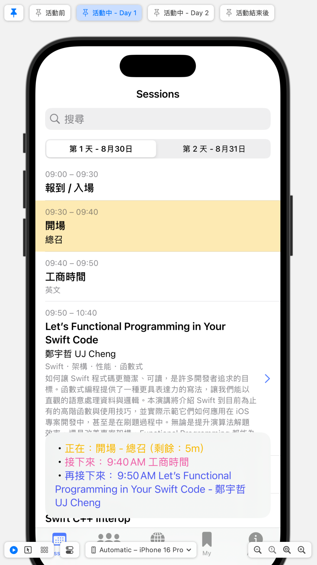 有一個比較特別的巧思:app 主要是在研討會期間使用,只要對照時間表,可以得知顯示當前的活動進展。所以我們在議程列表放置了一個目前、下一個、下下一個活動內容的小區塊。而且可以按下去,直接跳轉到列表。