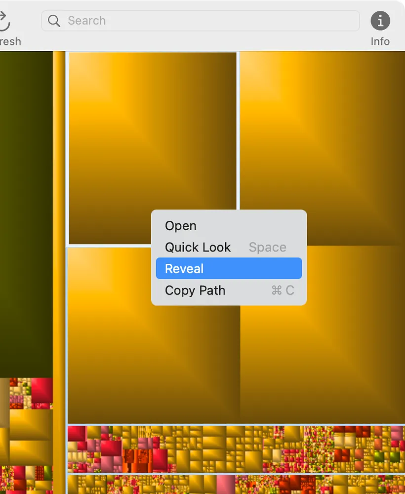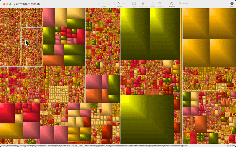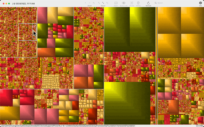 資料夾也會被框起來,所以「個別檔案不大,但是整個資料夾很大」的情況也很容易發現(例如 Xcode 的 Derived Data)。